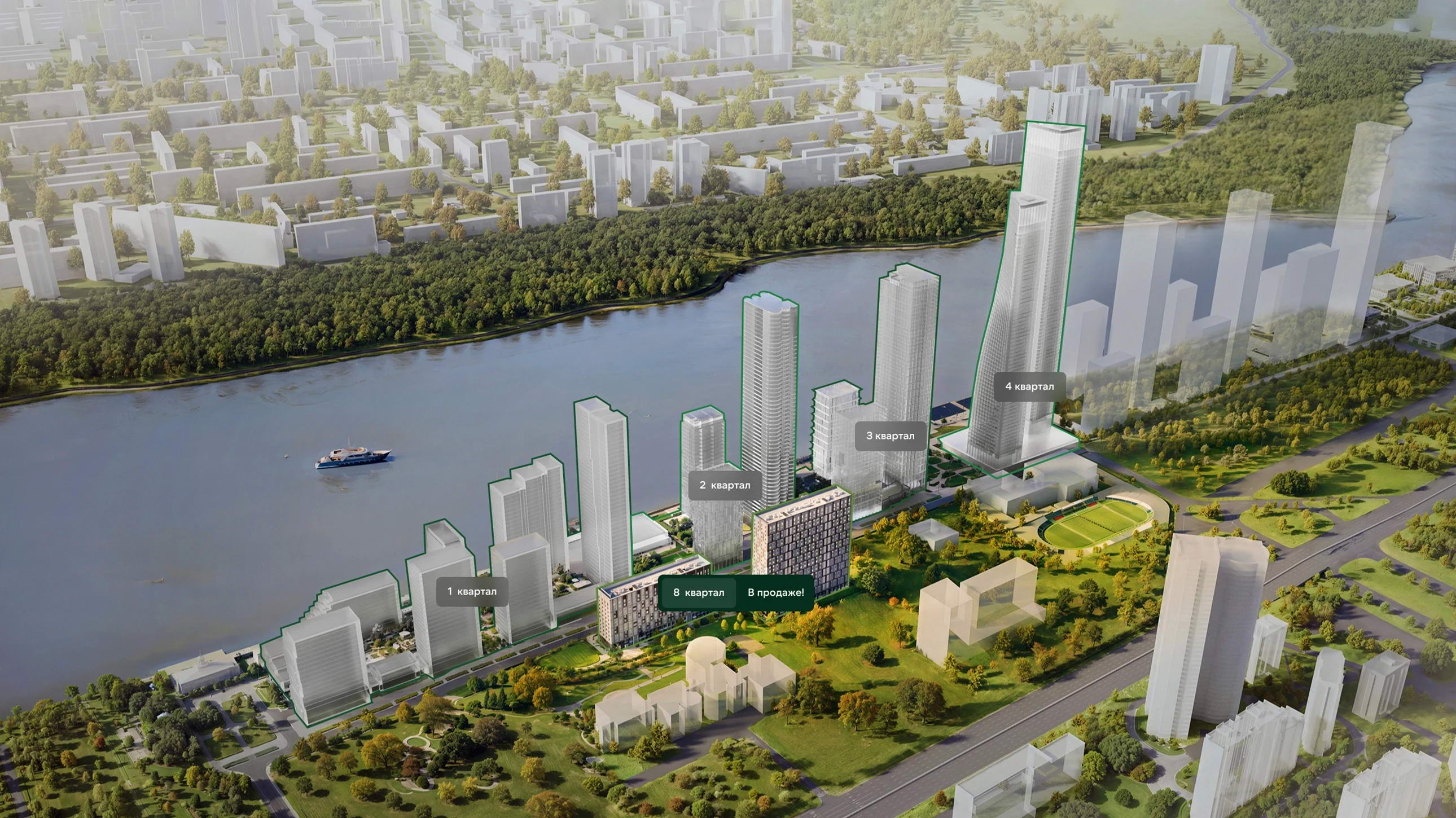 Благодаря своей камерности квартал идеально подойдет для семейных покупателей — он граничит с парковой зоной площадью 49 га, но при этом имеет удобный прямой выход на благоустроенную прогулочную набережную.